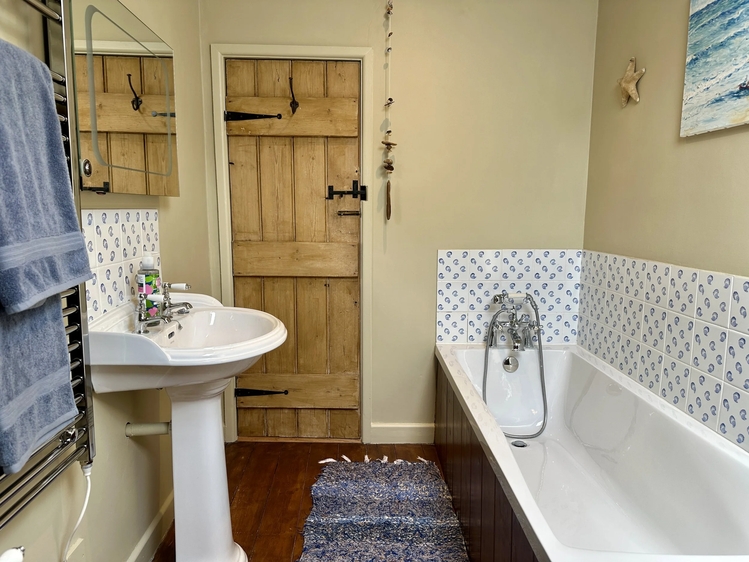 You'll also find a chest of drawers, wall hooks for hanging, a radio, and a TV—perfect for relaxing after a day exploring. Just next door, the private Shell bathroom is accessed via the landing and evokes a seaside feel, stocked with sustainable Faith in Nature shampoo, conditioner, and body wash.